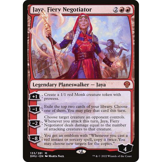 +1: Create a 1/1 red Monk creature token with prowess.?1: Exile the top two cards of your library. Choose one of them. You may play that card this turn.?2: Choose target creature an opponent controls. Whenever you attack this turn, Jaya, Fiery Negotiator deals damage equal to the number of attacking creatures to that creature.?8: You get an emblem with "Whenever you cast a red instant or sorcery spell, copy it twice. You may choose new targets for the copies."